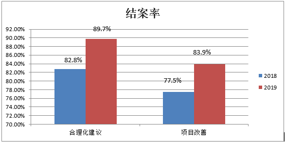 今年截止9月份,合理化建議共接收并被采納39項,結案35項,4項還在如期進展中,結案率89.7%,改善項目立項31項,結案26項,5項在如期進展中,結案率83.9%。同比去年的合理化建議結案率82.8%和項目改善結案率77.5%提升不少。