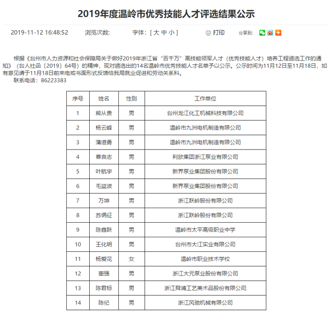 為高水平建設(shè)人才強省,進一步加快高技能人才隊伍建設(shè),我司根據(jù)《臺州市人力資源和社會保障局關(guān)于做好2019年浙江省“百千萬”高技能領(lǐng)軍人才培養(yǎng)工程遴選工作的通知》要求,通過我司推薦,經(jīng)資格初審、評委會評審等環(huán)節(jié),我司研發(fā)中心陳紀(jì)被評選為溫嶺市優(yōu)秀技能人才,并在網(wǎng)上予以公示,符合公司的價值觀 “客戶為先、誠信負責(zé)、團隊合作、務(wù)實創(chuàng)新”精神。