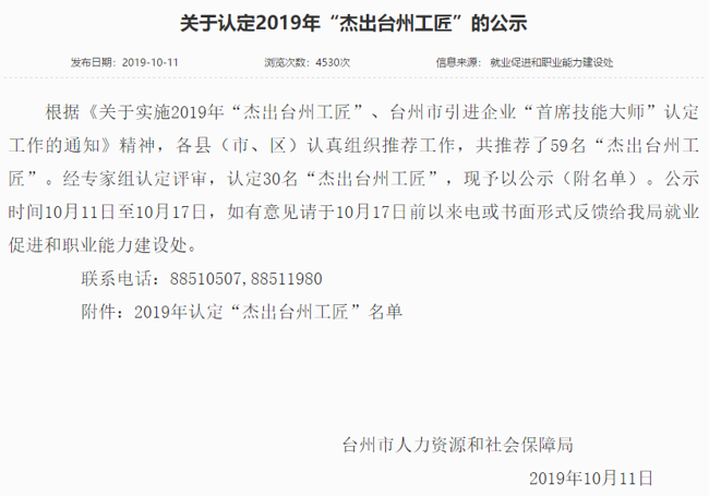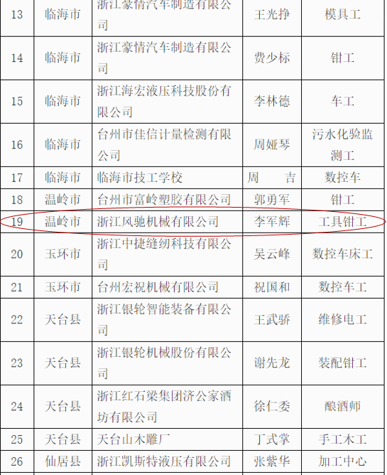 我司根據(jù)《關(guān)于實施2019年“杰出臺州工匠”、臺州市引進(jìn)企業(yè)“首席技能大師”認(rèn)定工作》的通知要求,通過公司推薦,資格初審,經(jīng)專家組認(rèn)定評審,我司研發(fā)中心工程師李軍輝成功順利入選被評選為“杰出臺州工匠”,并在網(wǎng)上予以公示,符合公司的價值觀“客戶為先、誠信負(fù)責(zé)、團隊合作、務(wù)實創(chuàng)新”精神。